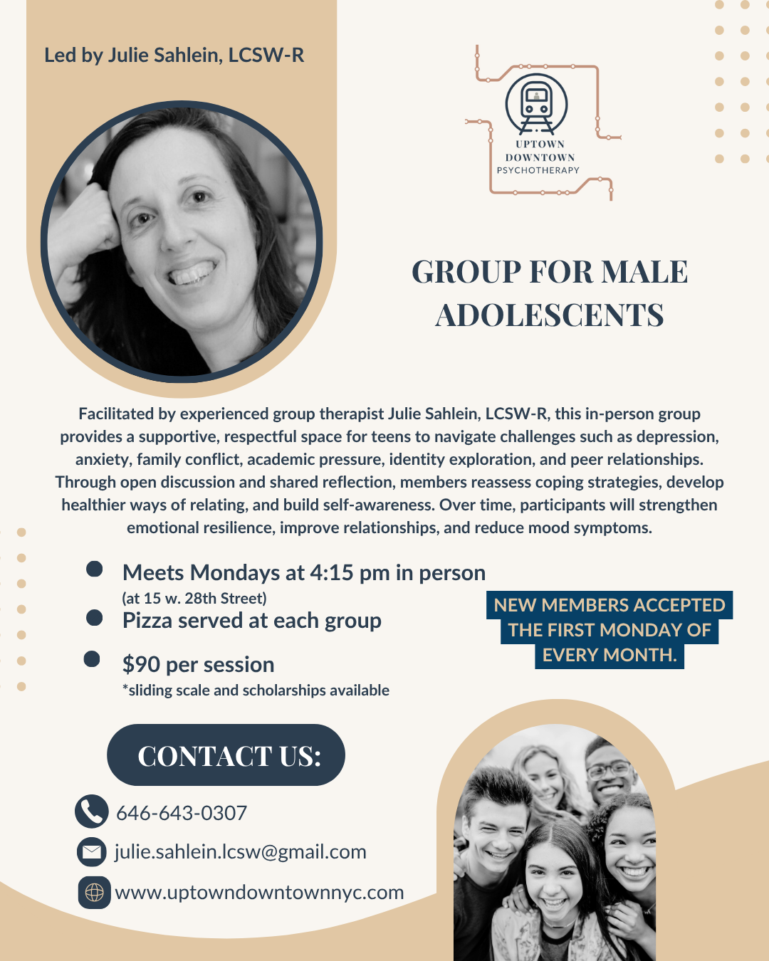 Led by experienced group facilitator Julie Sahlein, LCSW-R, this process group is open to male adolescents aged 14-17. The themes of discussion flow organically from members’ daily lives, including struggles with depression and anxiety, dealing with divorce/family conflict, navigating learning disabilities and/or academic pressure, exploring identity questions and working through challenges with peers. In an environment that is supportive and respectful, group members are challenged to reassess coping strategies or relational styles that may be outdated. Each group session offers opportunities for teens to develop new ways of relating to peers and to themselves. Over time, treatment outcomes include strengthened observing egos, decrease in mood symptoms and improved relational skills.